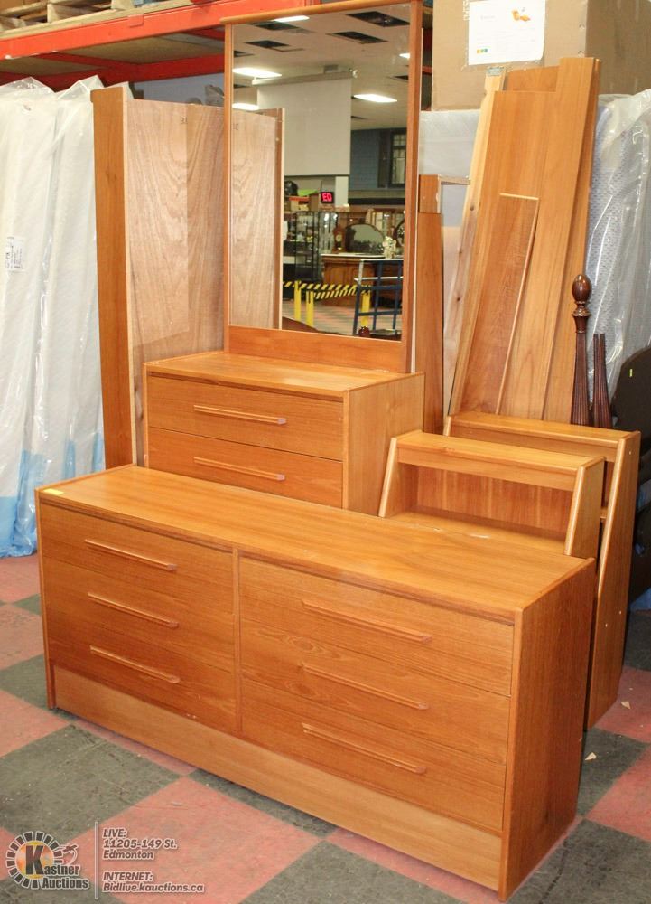 BED FRAME, 6 DRAWER DRESSER, CHEST OF DRAWERS WITH MIRROR.