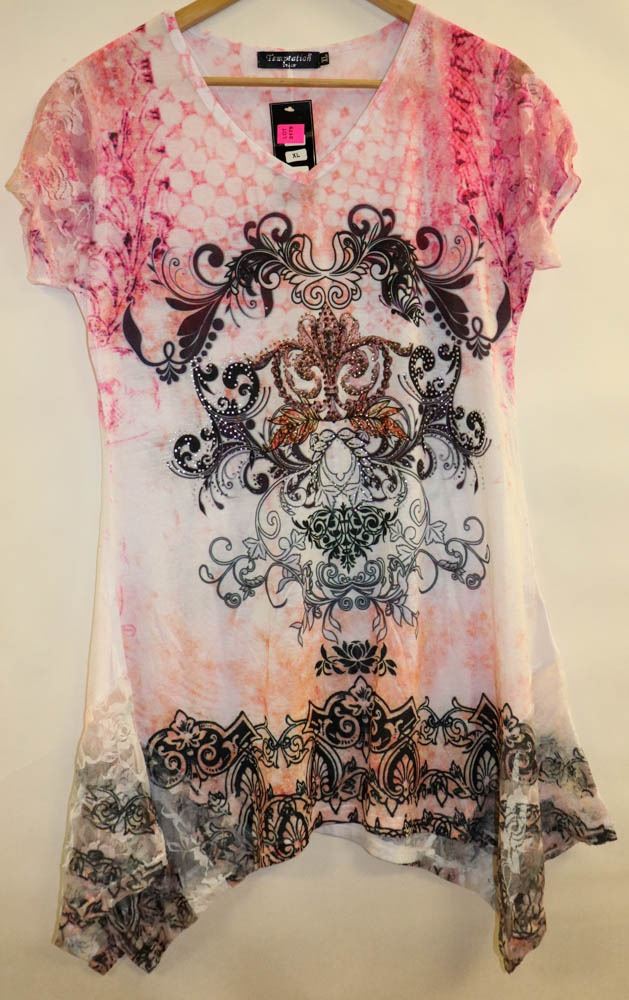 WITH PEACH AND PINK ACCENTS , HAS LACE SLEEVE AND BOTTOM SIZE XL