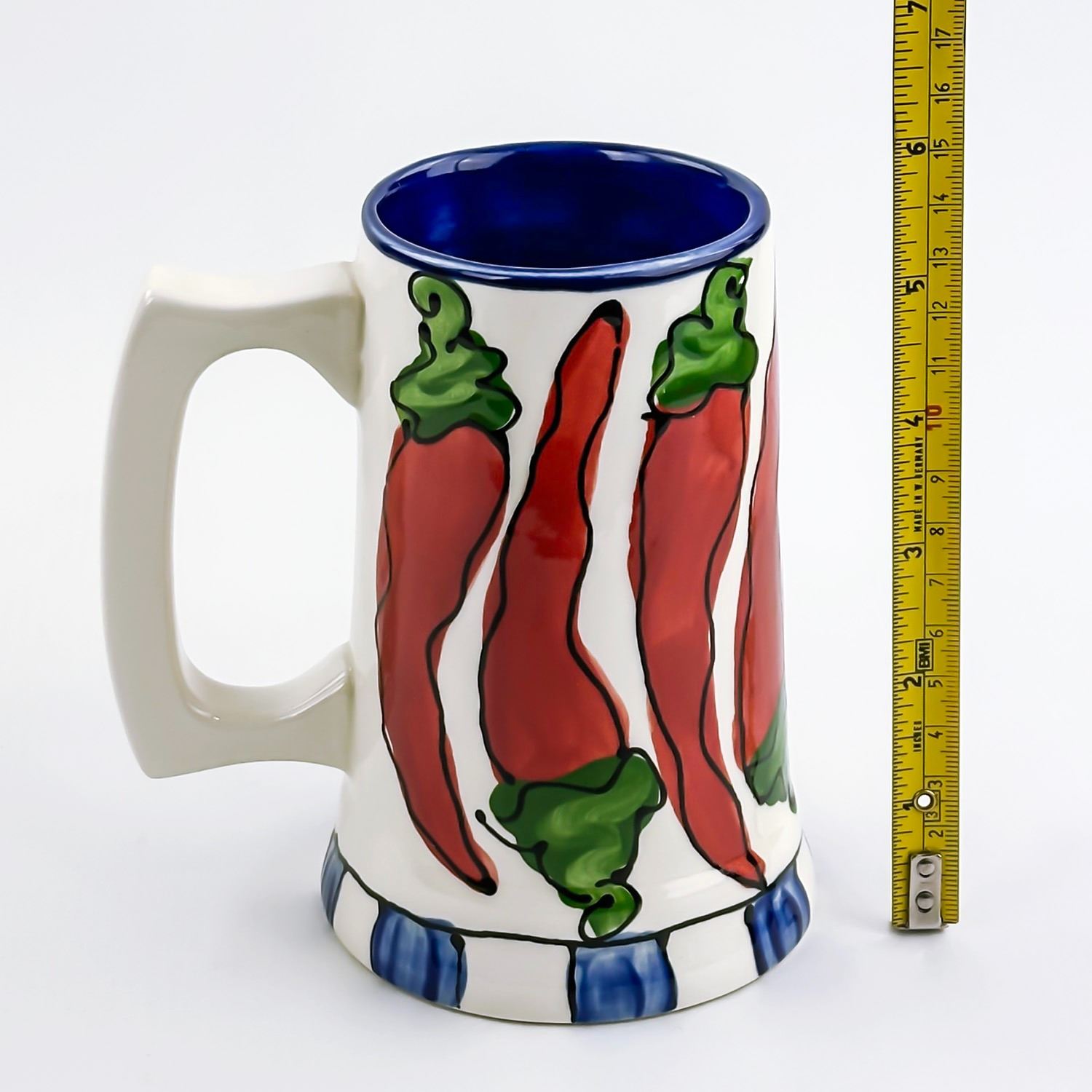 #8246 - HAND CRAFTED STUDIO ART POTTERY MUG BY THE TERRA COTTA DUDES - ALBERTA, CANADA. MUG DESIGN DEPICTS RED HOT CHILI PEPPERS. HOME OFFICE KITCHEN BAR BARWARE DECOR COFFEE OR BEER MUG ART SCULPTURE. MEASURES: 5.5” (14 CM) TALL