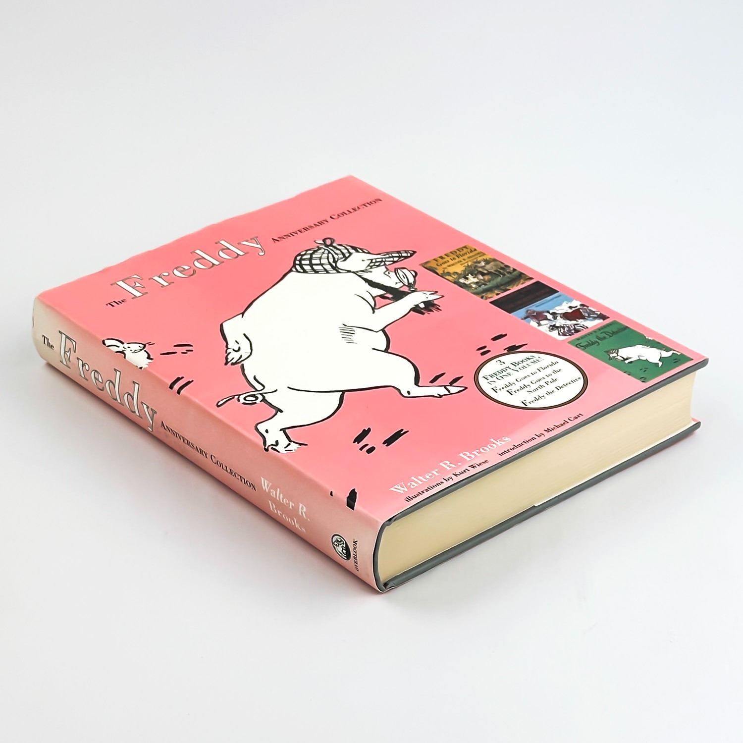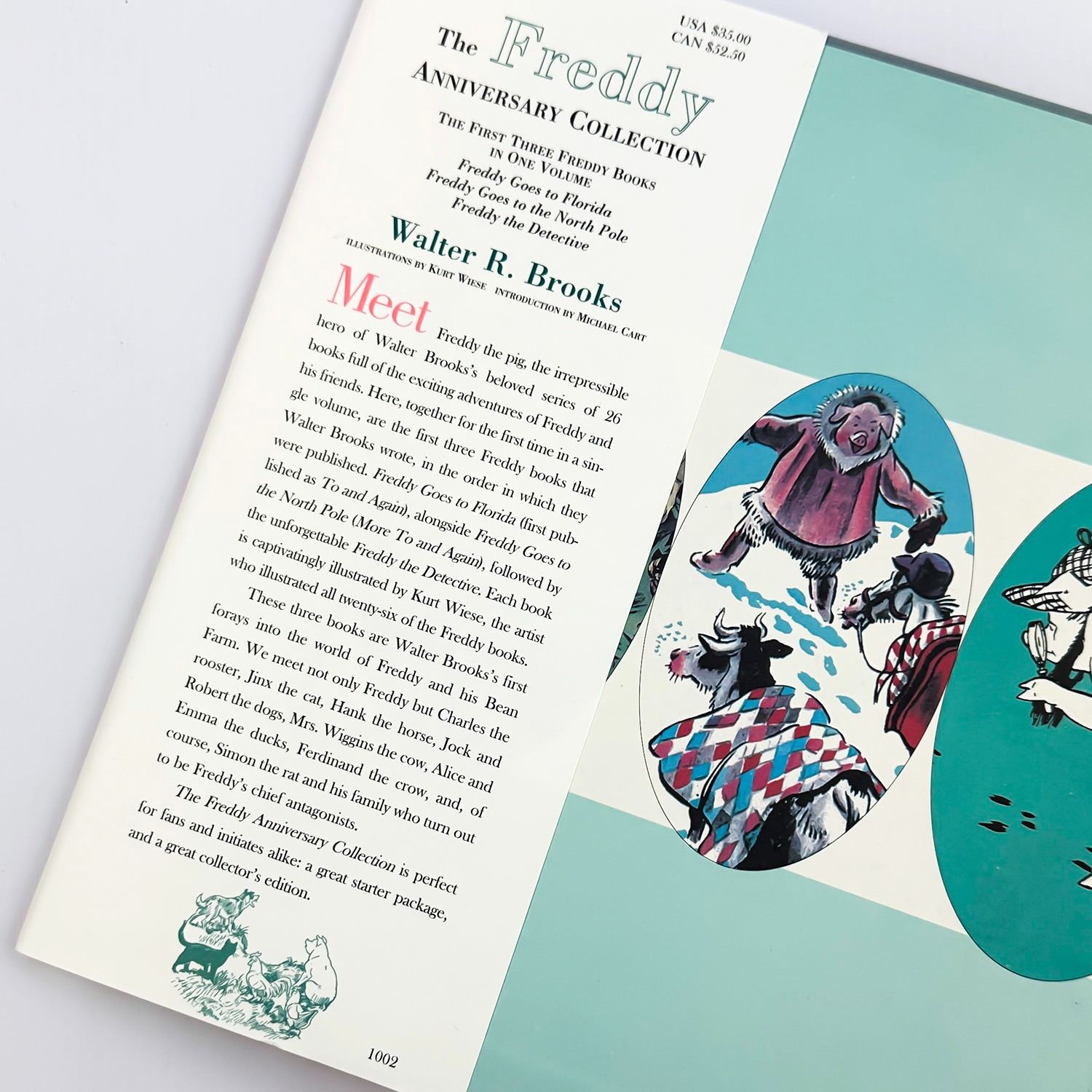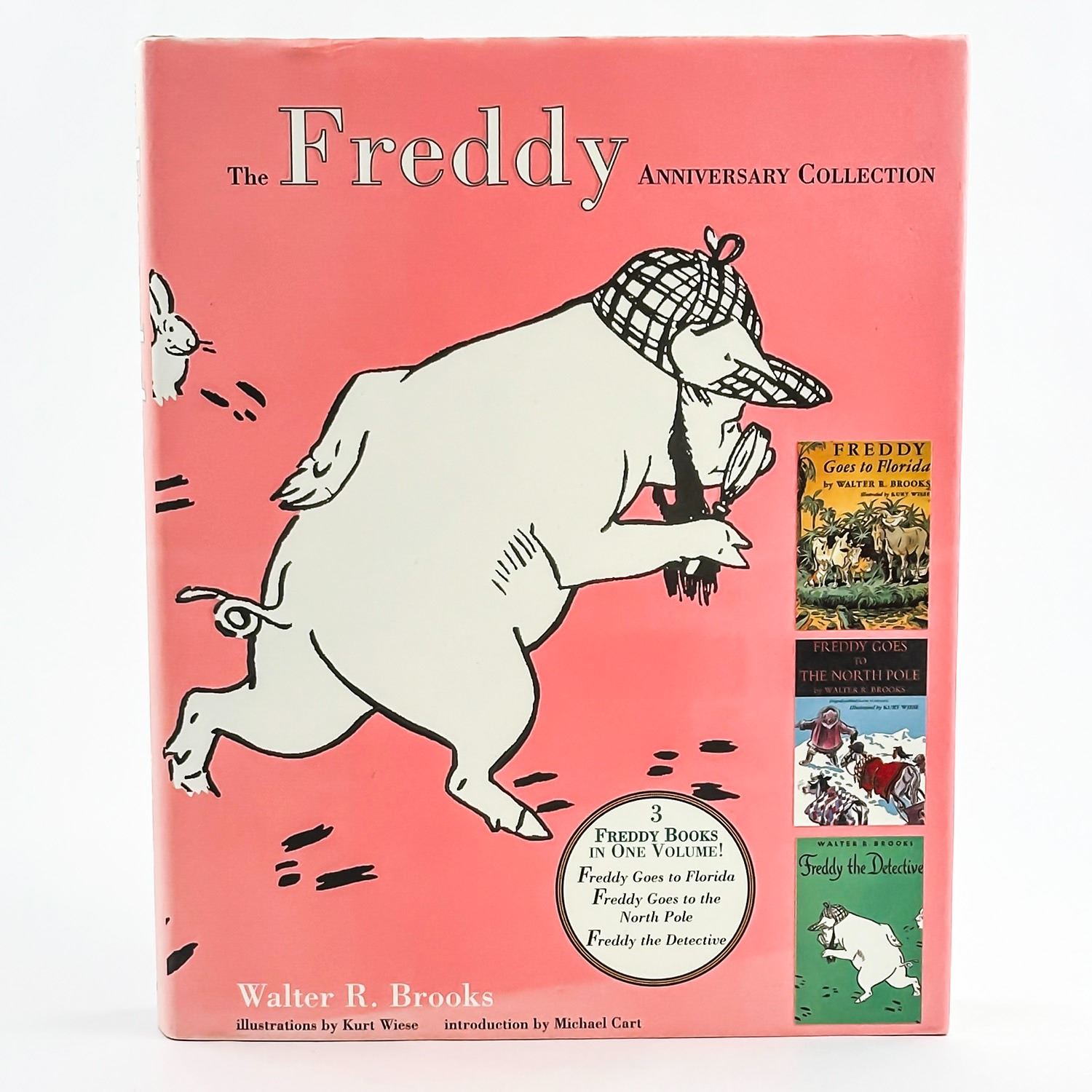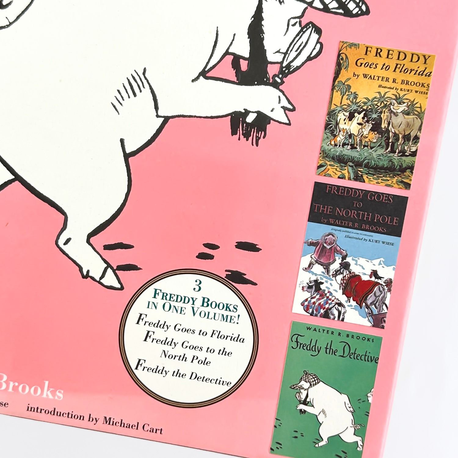 #9085 - THREE FREDDY BOOKS IN ONE VOLUME! BY WALTER R. BROOKS. FREDDY GOES TO FLORIDA, FREDDY GOES TO THE NORTH POLE, FREDDY THE DETECTIVE. HARDCOVER WITH DUST JACKET - COPYRIGHT 2002 - 432 PAGES. MEASURES: 10.25” (26 CM) BY 8.25” (21 CM) AND 1.5” (4 CM) THICK