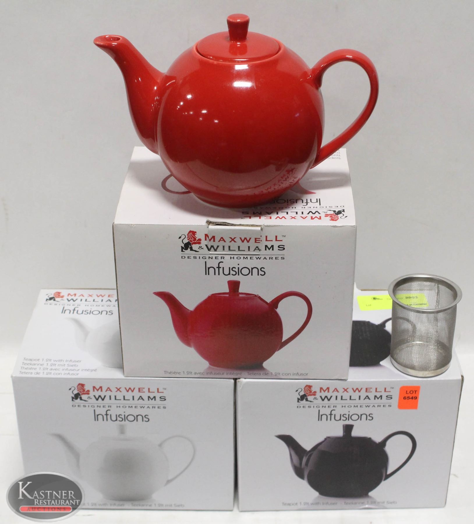 INFUSING BASKET FOR TEA. MAXWELL & WILLIAMS DESIGNER HOMEWARES. BLACK & WHITE, RED.