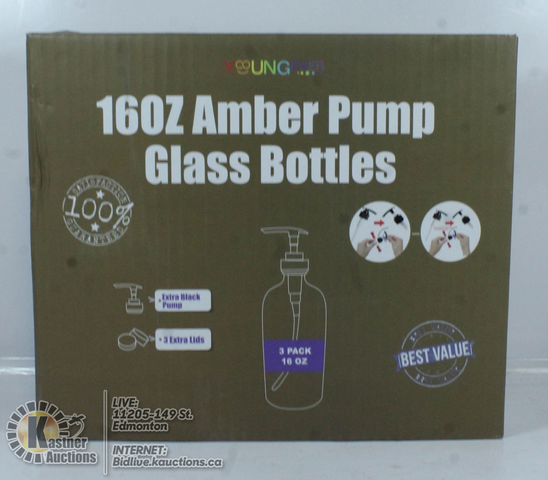 THREE PACK 16OZ AMBER PUMP GLASS BOTTLES