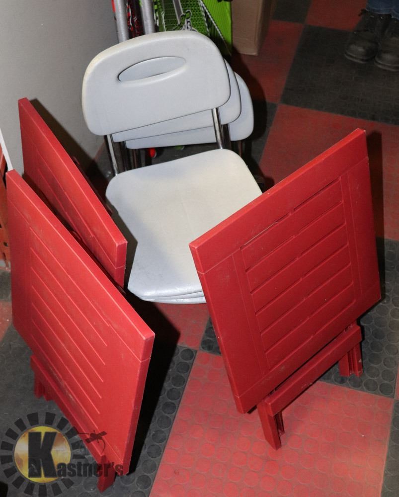 THREE SMALL PLASTIC TABLES WITH 3 CHAIRS