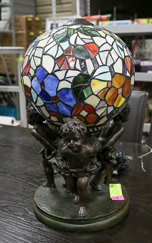 TIFFANY CHERUB GLOBE LAMP 19" TALL, HEAVY METAL
