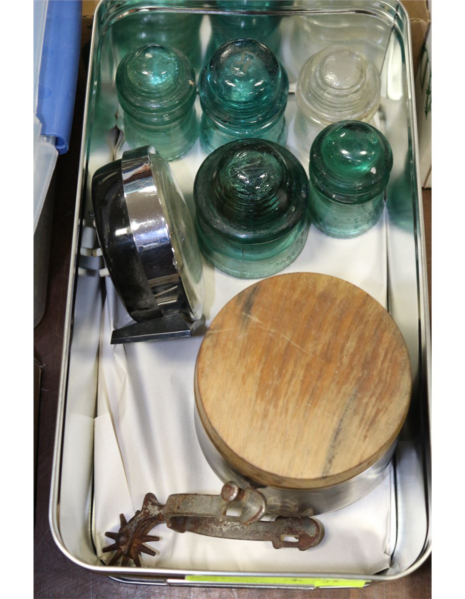 ALARM CLOCK (WKG), VINTAGE CERAMIC TOBACCO CANISTER W/ HUMIDORE & 5 ANTIQUE GLASS INSULATORS