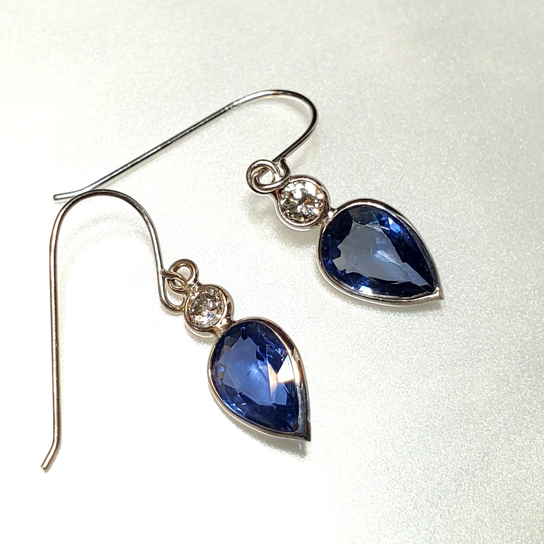 14K WHITE GOLD CEYLON SAPPHIRE(1.65CT) DIAMOND(0.17CT) HANDCRAFTED DANGLE EARRINGS (~WEIGHT 0.6G), MADE IN CANADA