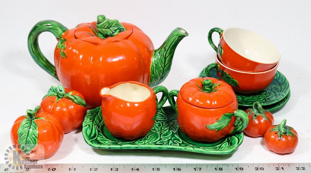 TOMATO TEA SET WITH CREAM, SUGAR, SALT & PEPPER.