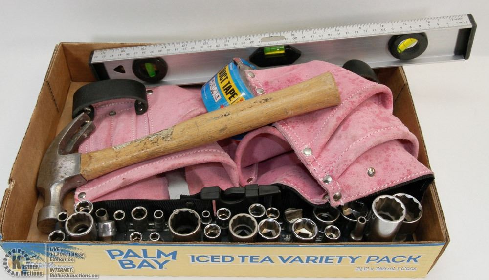 TOOL LOT W/ TOOL POUCH, HAMMER, SOCKETS & MORE