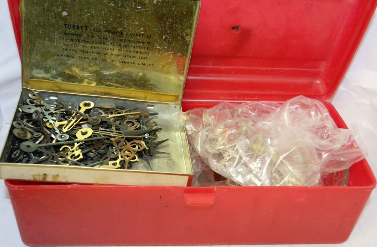 INCLUDES POCKET WATCH, CIGARETTE TIN, CLOCK PIECES, AND MORE