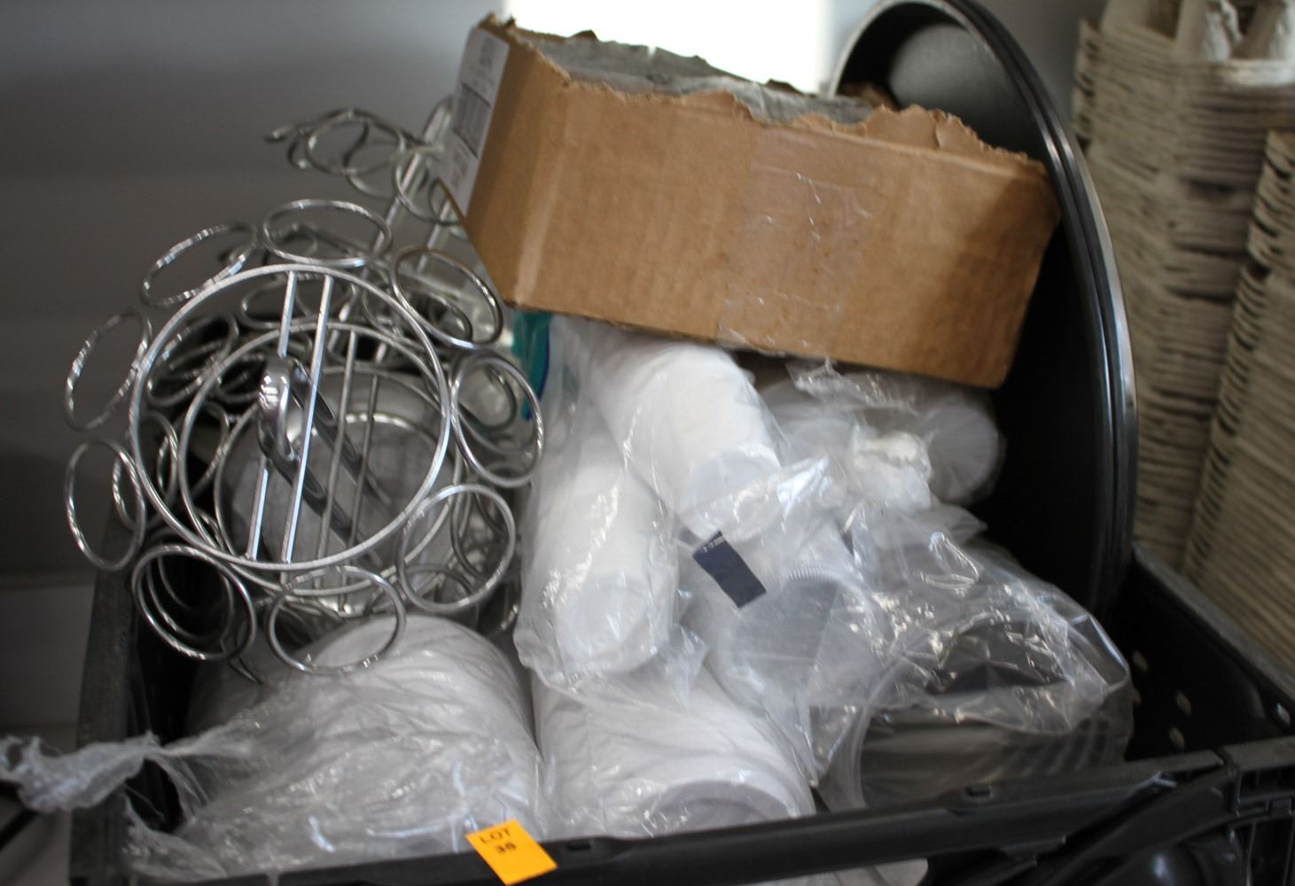 TOTE OF ASSORTED DISPOSABLE CUPS, SERVING TRAYS