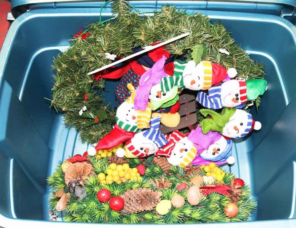 TOTE OF CHRISTMAS ORNAMENTS AND WREATHS