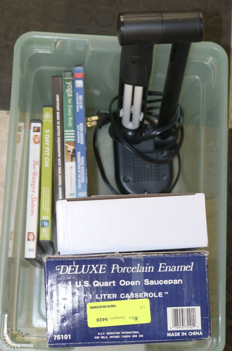 TOTE OF DVD'S, DESK LAMPS, AND ASSORTED FIGURINES