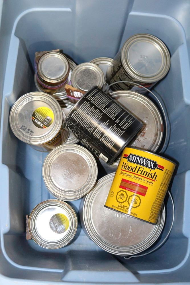 TOTE WITH ASSORTED PAINTS AND STAINS