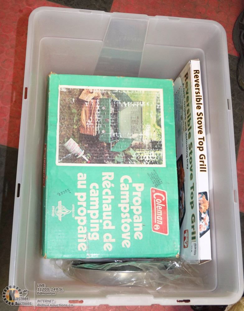 TOTE WITH COLEMAN CAMP STOVE ETC