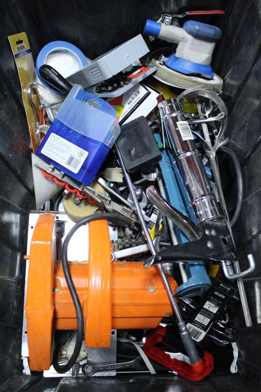 TOTE WITH LARGE ASSORTMENT OF WRENCHES AND TOOLS