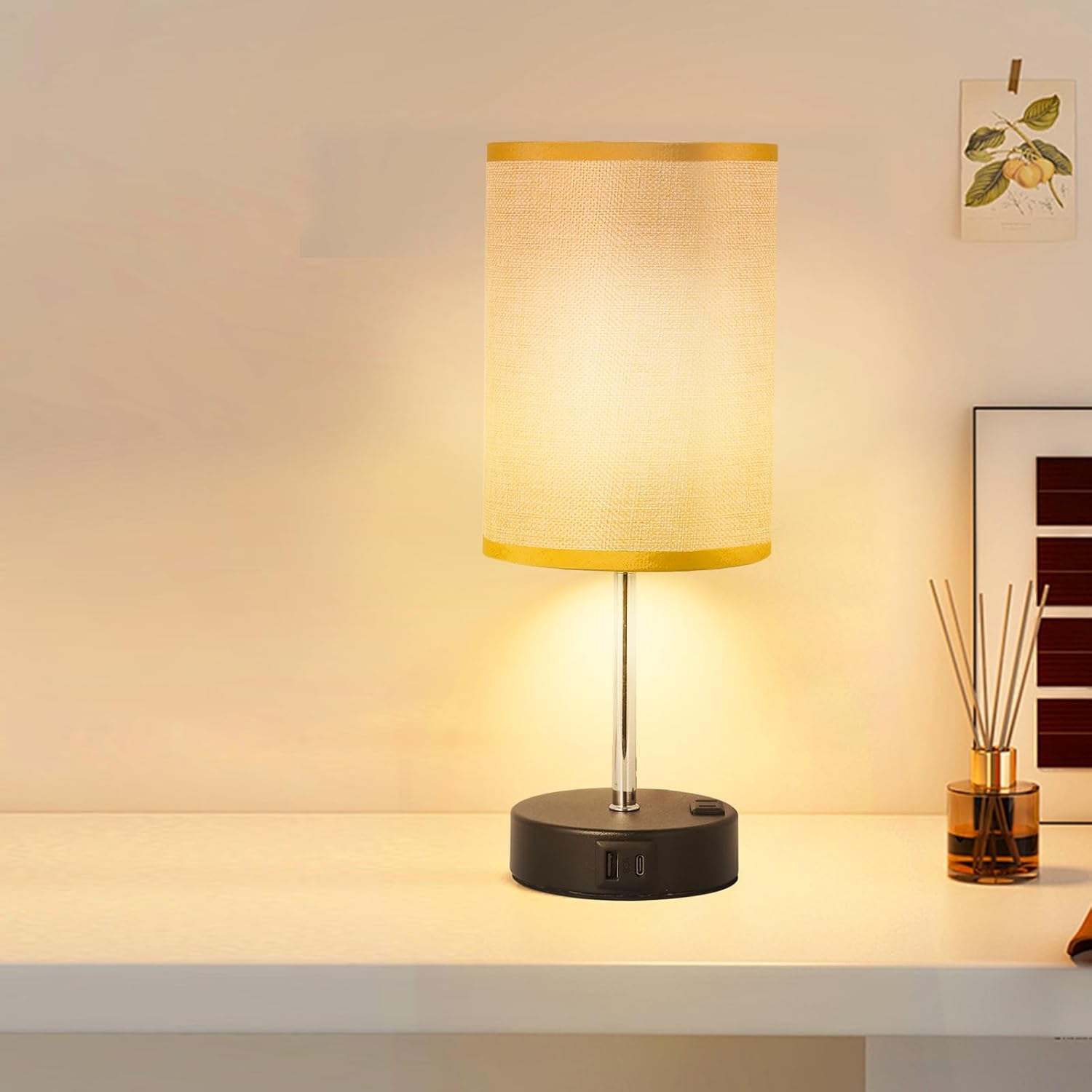 TOUCH TABLE LAMP - 3 WAY DIMMABLE BEDSIDE TABLE LAMP WITH USB-C USB-A AND AC CHARING PORTS WOOD GRAIN BASE WITH LINEN LAMPSHADE FREE E26 BULB INCLUDED (SATIN BLACK), SMALL, NV-TL001-10