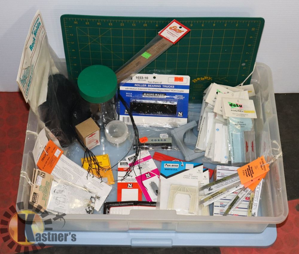 ROCK MOLDS, HOBBY MAT, N SCALE CONTAINERS (8 PACKAGES OF 2 AND MISC), ROLLER BEARING TRUCK COUPLERS, TRUCK ALIGNMENT GAUGES (N SCALE 22" 24" 34" 36"), N SCALE RULER REFERENCE, TRACKSETTA 9" AND 12" RADIUS, TRACK TOOL SET, 4 PKGS MT-10