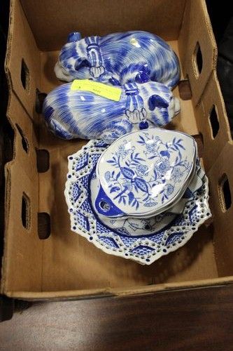 TRAY OF BLUE AND WHITE CERAMIC DISHES ON CHOICE