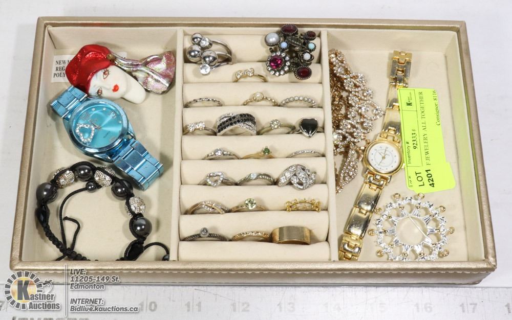 LADY BROOCH, 22 RINGS, 2 WATCHES, RHINESTONE NECKLACE AND MAGNETIC HEALTH BRACELET