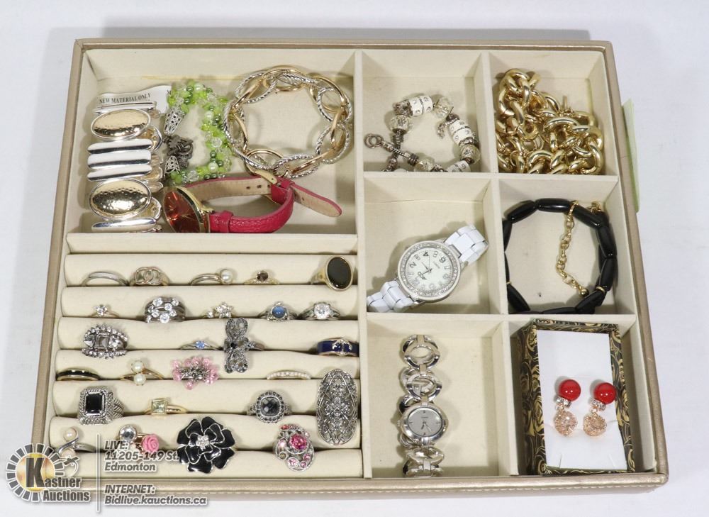 25 RINGS, WATCHES, EARRINGS, BRACELETS, PEARL AND SEMI PRECIOUS STONES