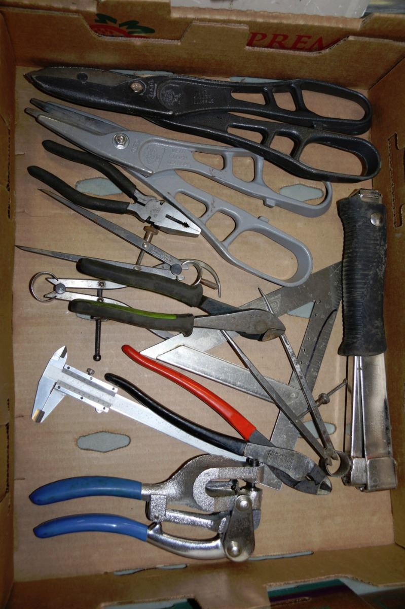 TRAY OF TIN SNIPS,MICROMETER,STAPLER,HAMMERS &