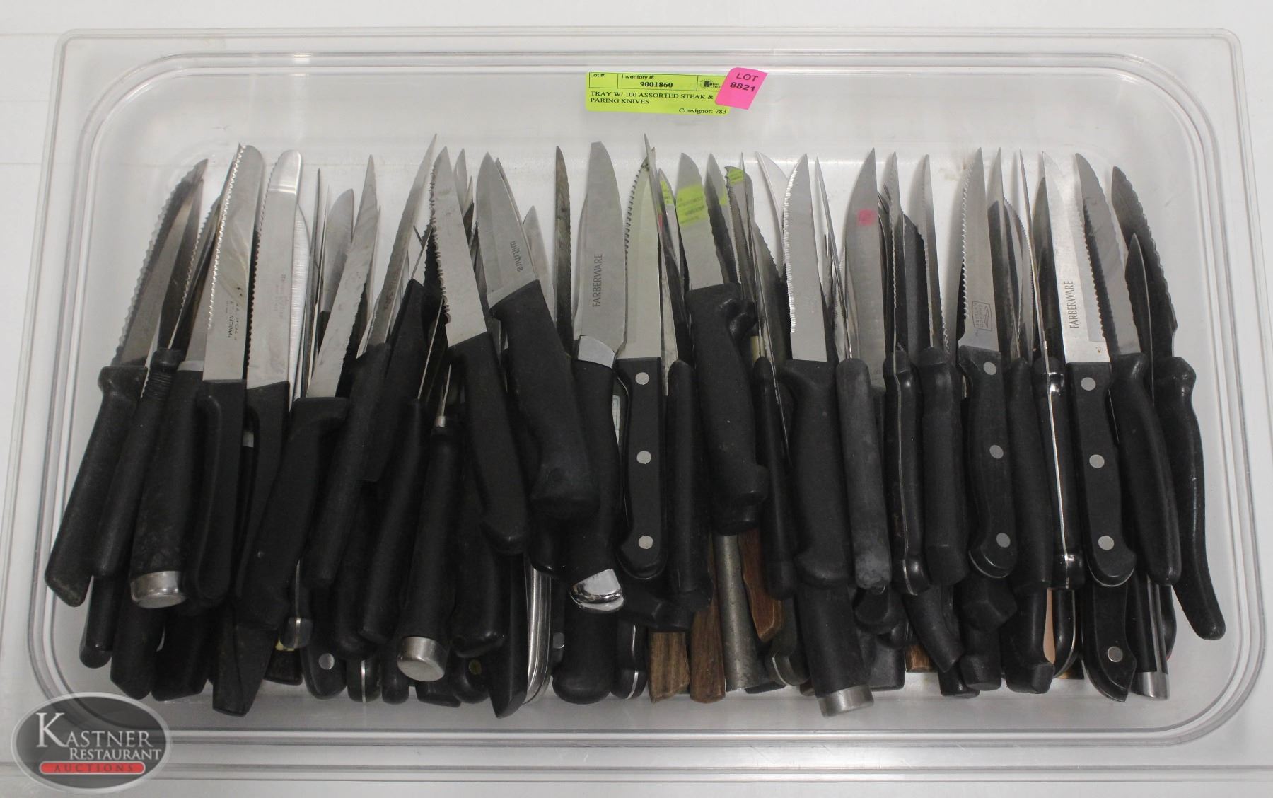 TRAY W/ 100 ASSORTED STEAK & PARING KNIVES