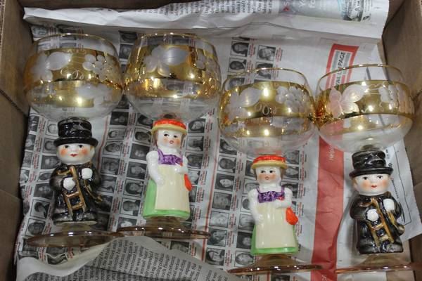 TRAY W/ 4 HUMMEL WINE GLASSES TRIMMED IN 14K GOLD