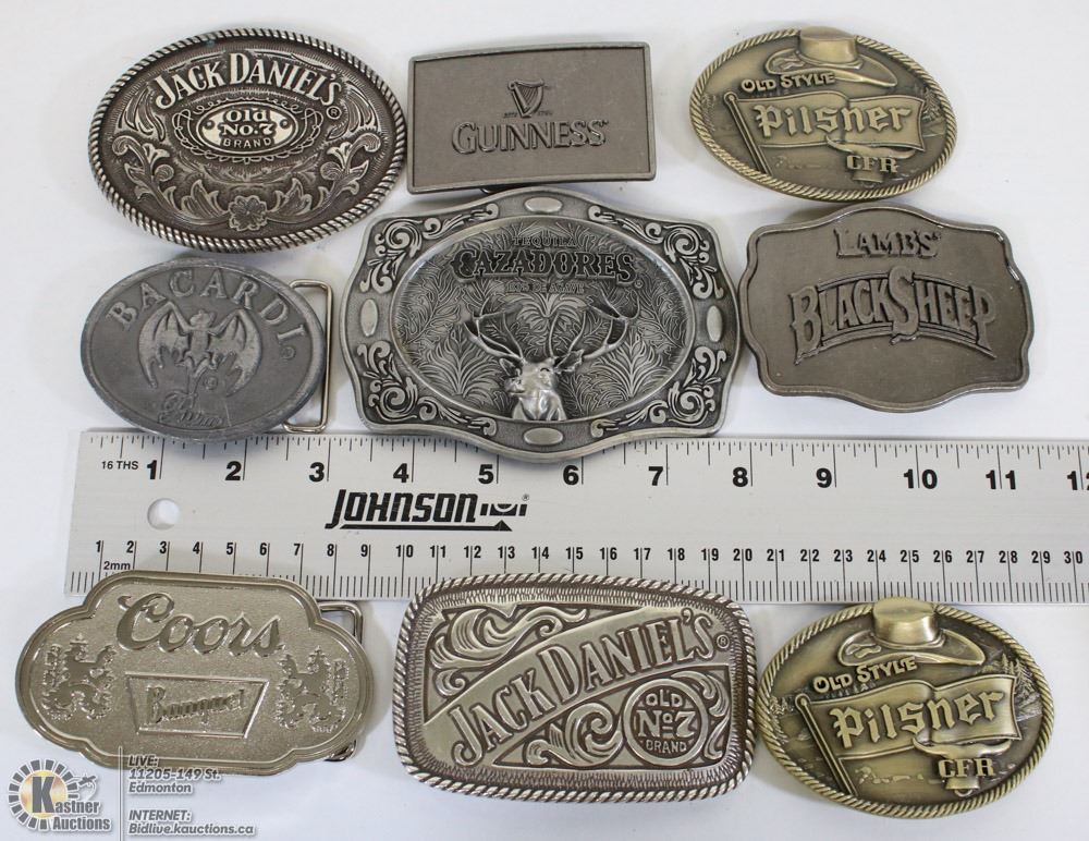 TRAY W/ 9 LIQUOR BEER BELT BUCKLES