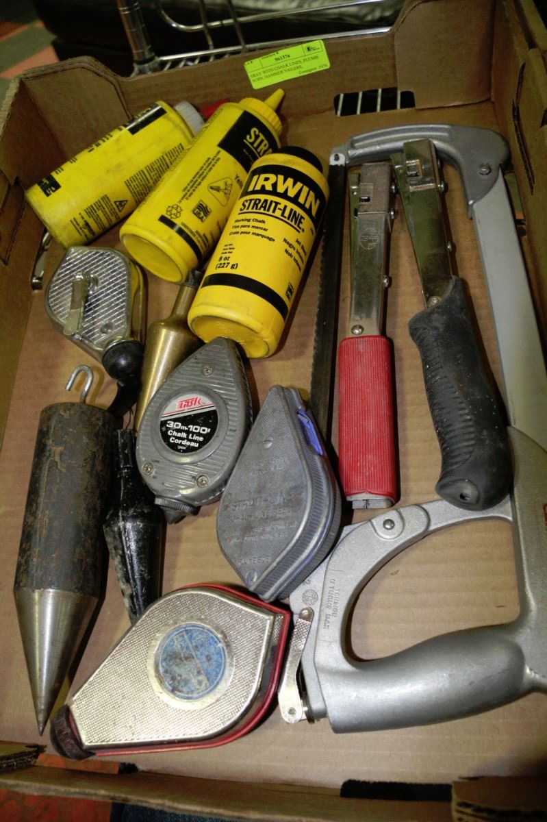 TRAY WITH CHALK LINES, PLUMB BOBS, HAMMER NAILERS,