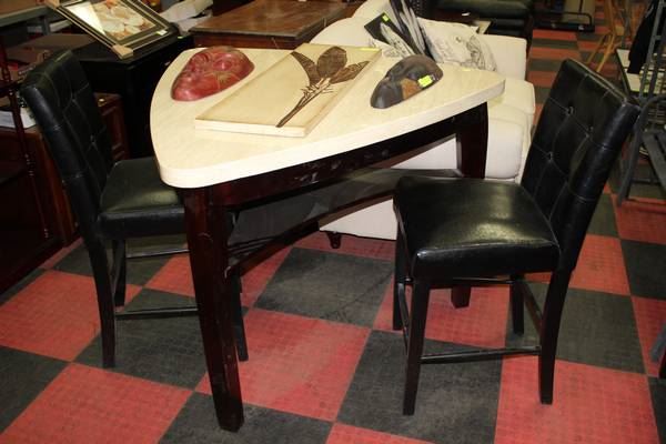 TRIANGULAR TABLE W 2 BLACK LEATHERETTE STOOLS