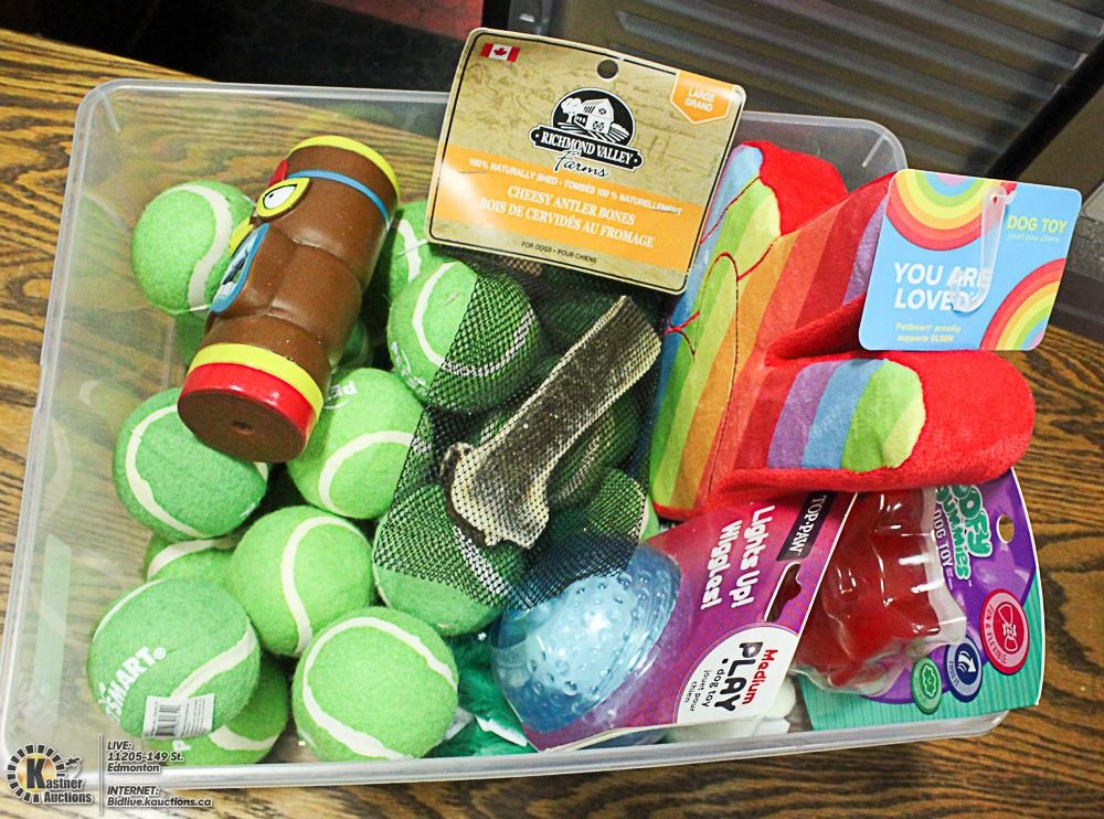TUB OF ASSORTED DOG TOYS, TENNIS BALLS,