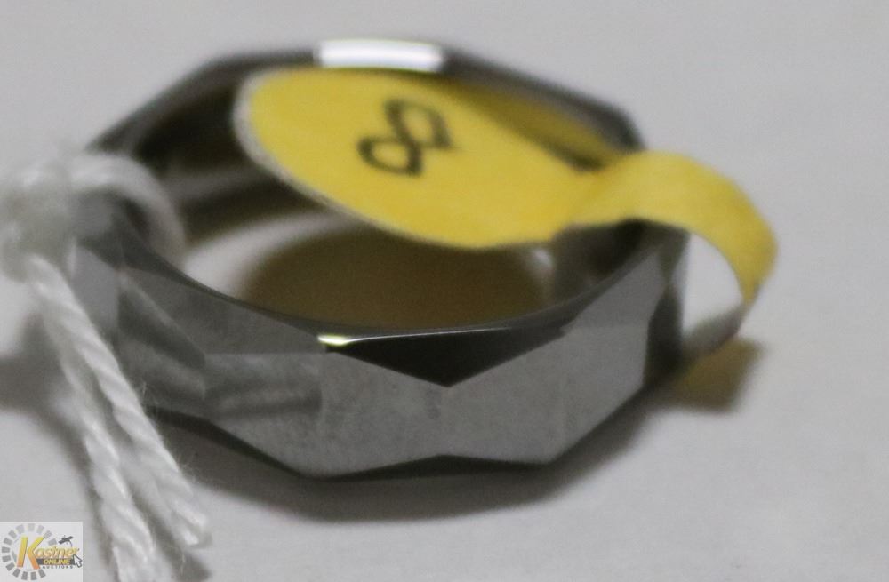 SILVER FACETED DESIGN. SIZE 8, 6MM WIDE, 9.8 GRAMS.