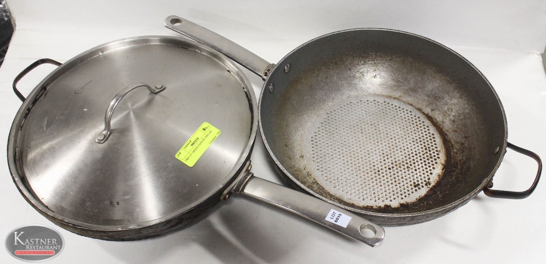 TWO 13" GREEN PANS W/ ONE LID