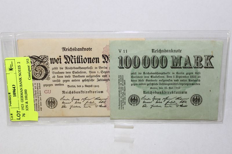 TWO 1923 GERMAN BANK NOTES 2 MILLION & 100,000