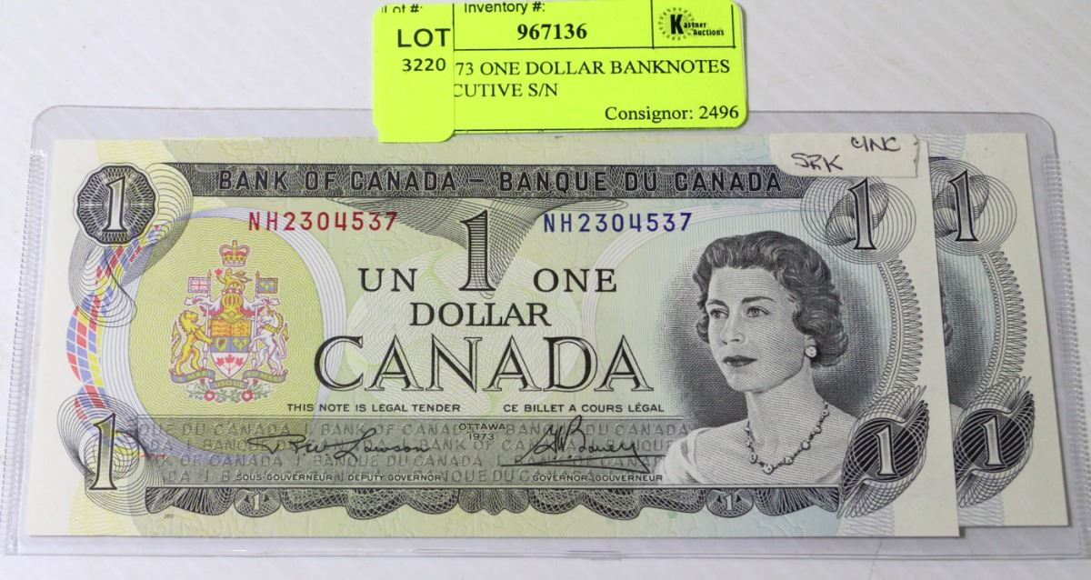 TWO 1973 ONE DOLLAR BANKNOTES CONSECUTIVE S/N