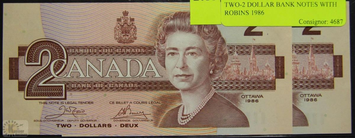 TWO-2 DOLLAR BANK NOTES WITH ROBINS 1986