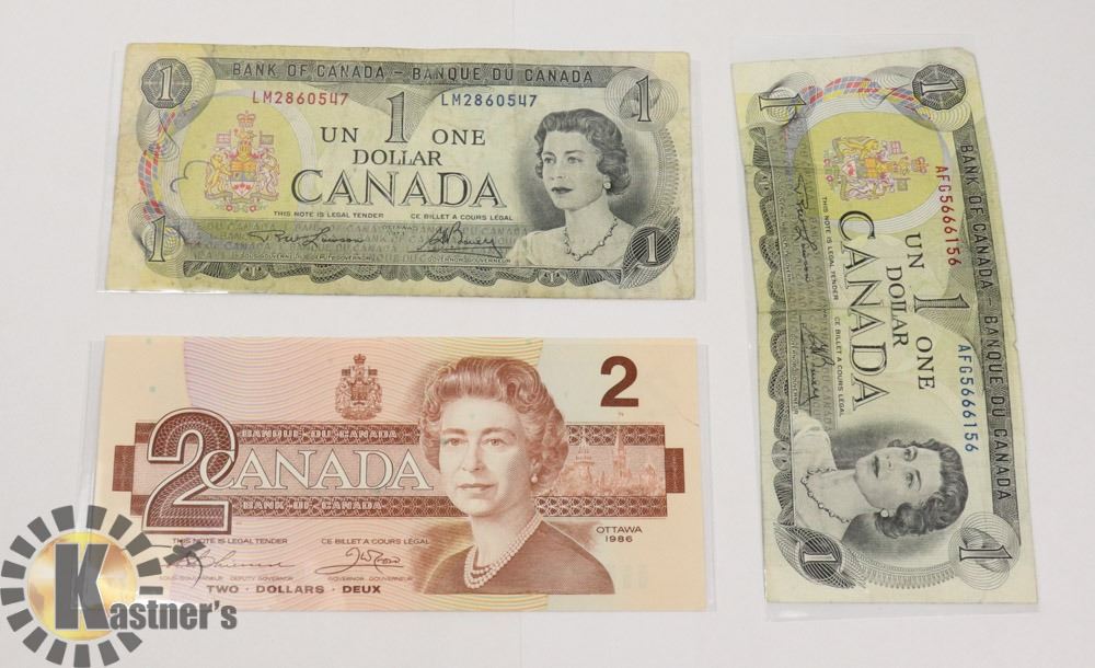 TWO CANADIAN 1972 $1 BILLS & ONE 1986 $2 BILLS
