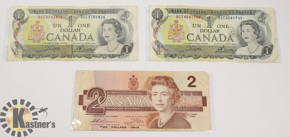 TWO CANADIAN 1972 $1 BILLS & ONE 1986 $2 BILLS