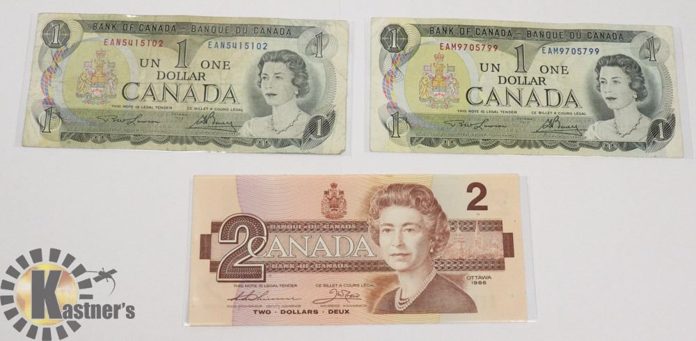 TWO CANADIAN 1972 $1 BILLS & ONE 1986 $2 BILLS