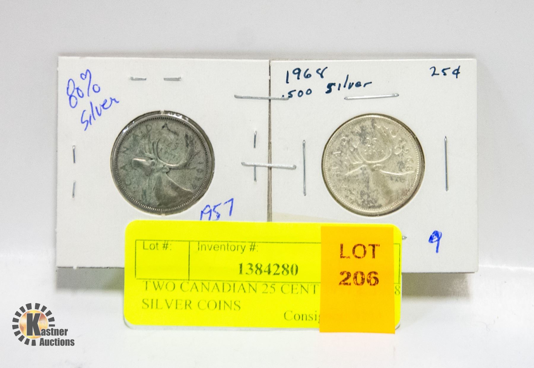 TWO CANADIAN 25 CENT 1957 & 1968 SILVER COINS