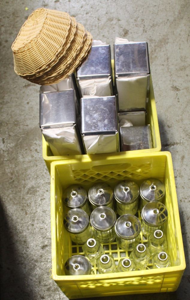 TWO CRATES OF SUGAR AND NAPKIN DISPENSERS