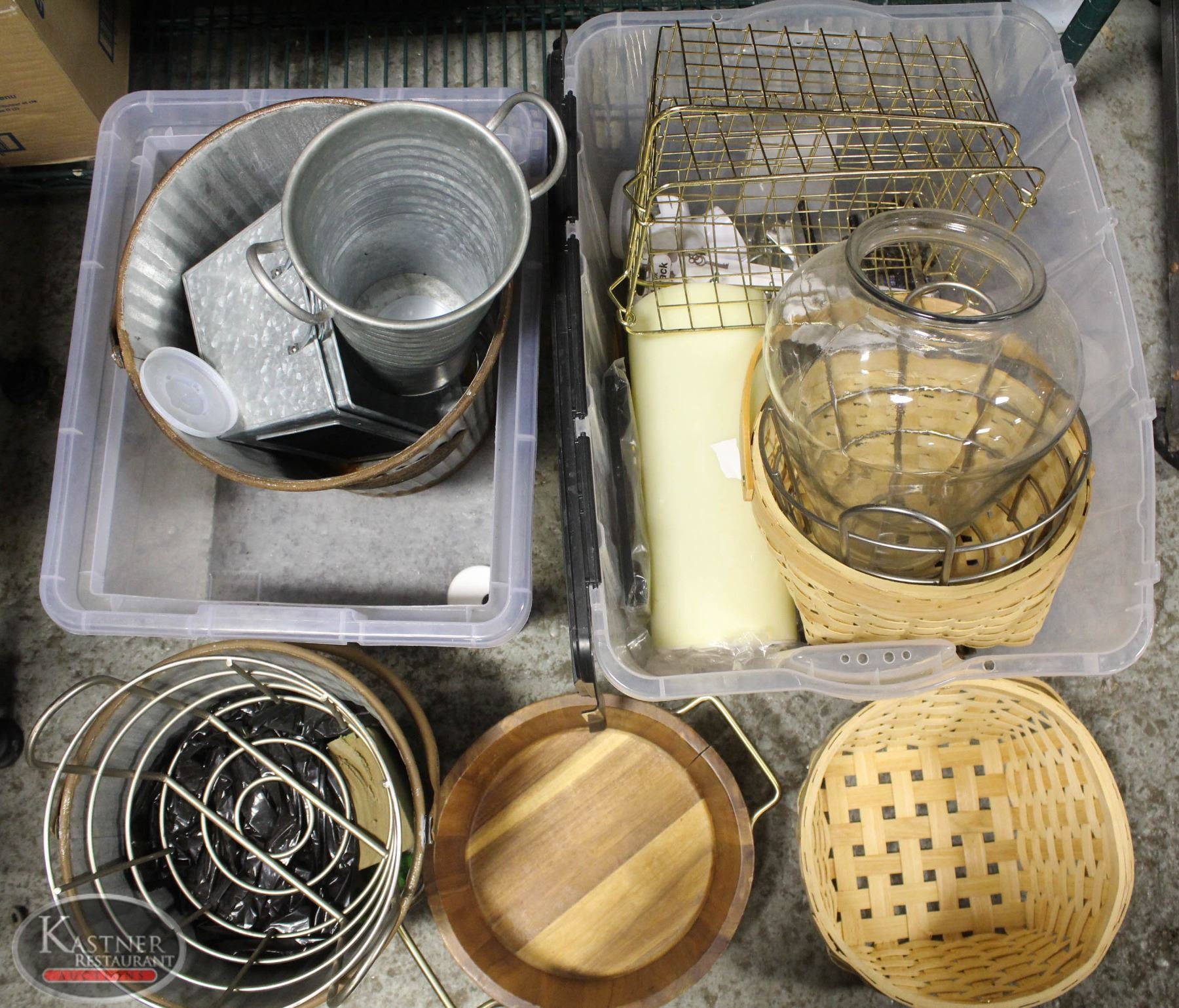 TWO CRATES VARIOUS WOOD & WIRE BASKETS, DECORATIVE