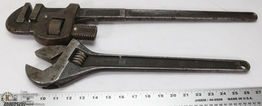 E.T.F. 24" PIPE WRENCH, MADE IN ONTARIO, 15 LBS.; CRESCENT TOOL COMPANY 18" CRESCENT WRENCH, MADE IN JAMESTOWN, NY., 6 LBS.