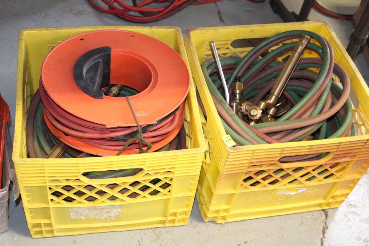 TWO MILK CRATES WITH OXY-ACETELYNE HOSES & TORCHES