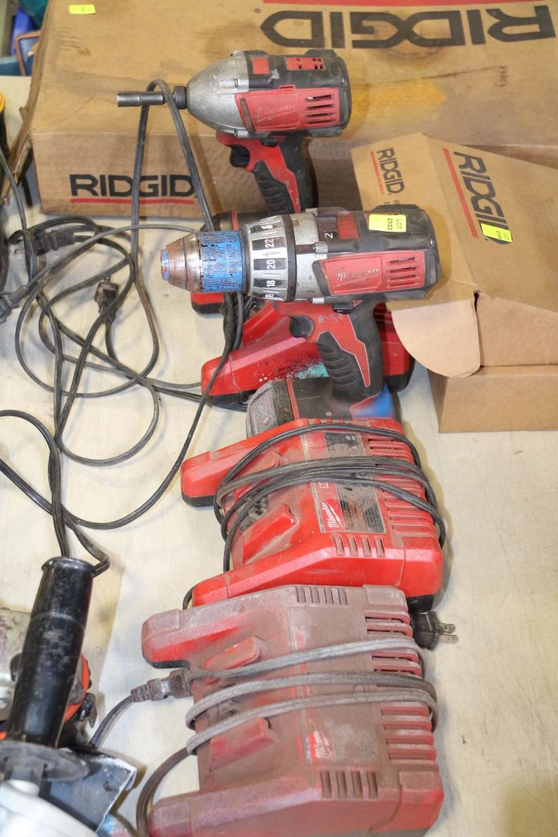 TWO MILWAUKEE CORDLESS DRILLS WITH THREE CHARGERS