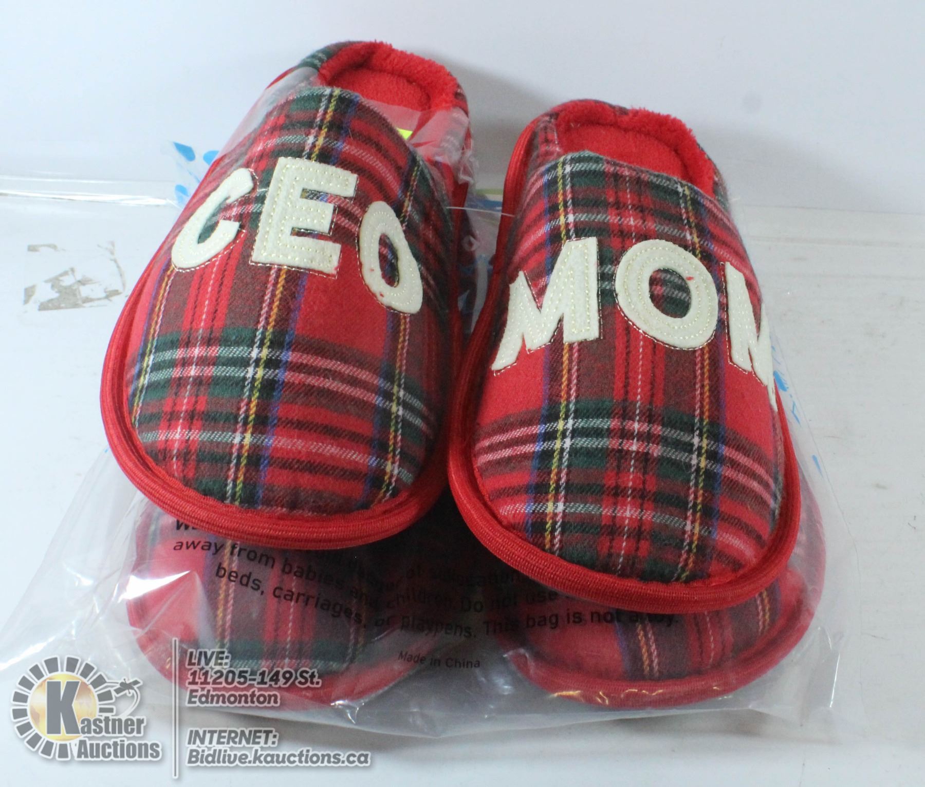 TWO PAIRS OF BERGMAN KELLY "CEO MOM" SLIPPERS.