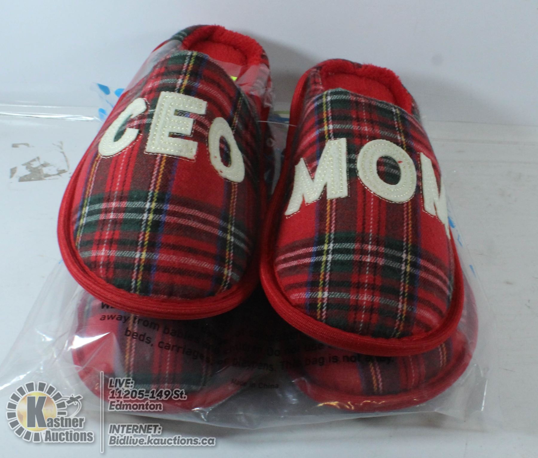 TWO PAIRS OF BERGMAN KELLY "CEO MOM" SLIPPERS.