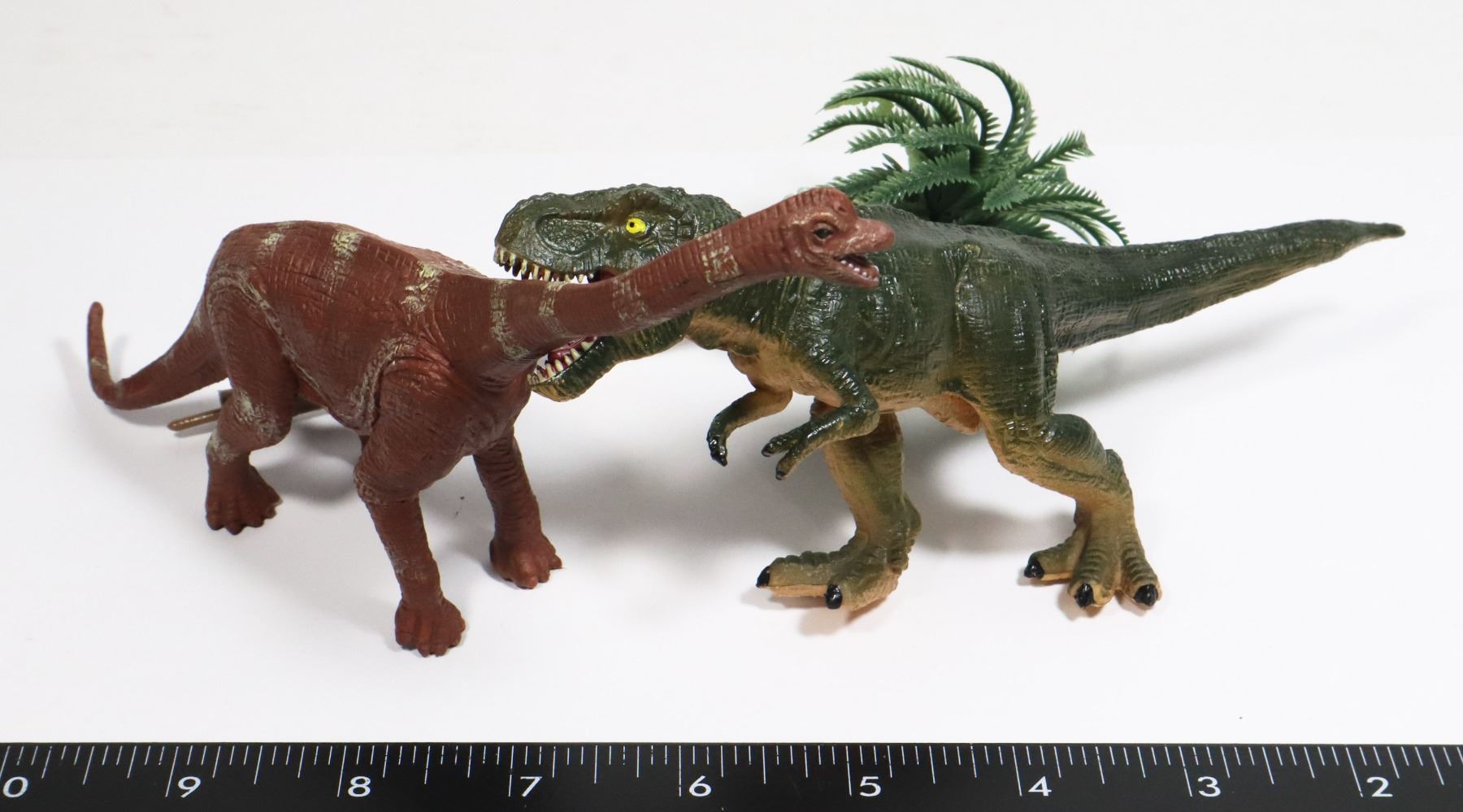 TWO TOY DINOSAURS MEDIUM SIZE WITH PALM TREE