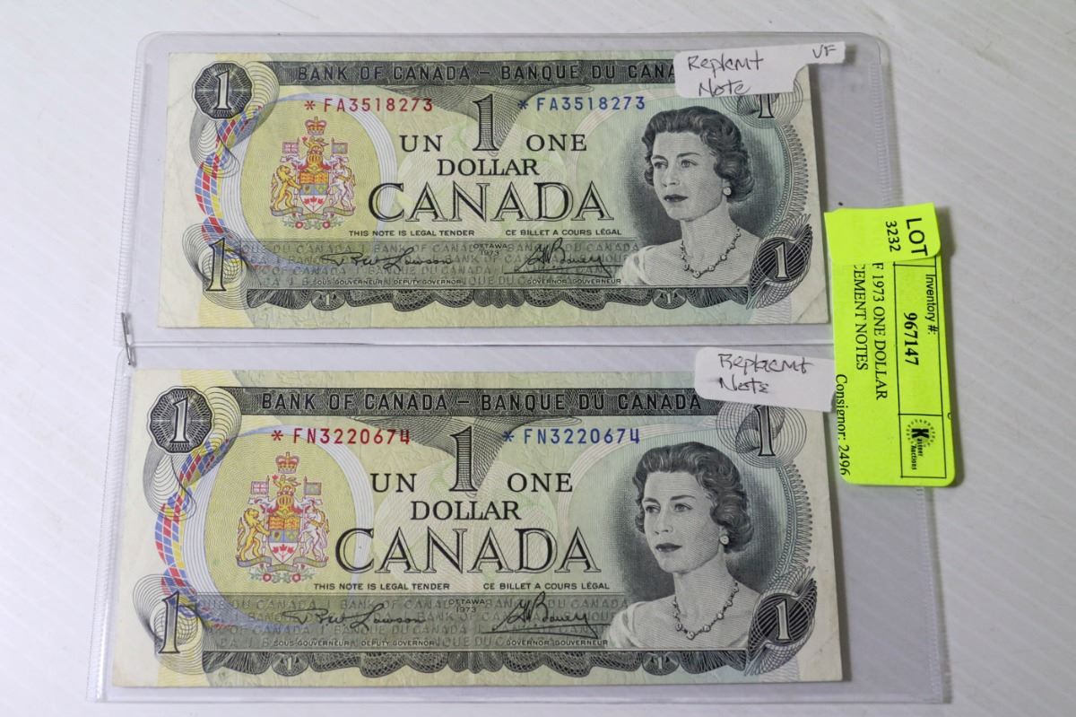 TWO VF 1973 ONE DOLLAR REPLACEMENT NOTES