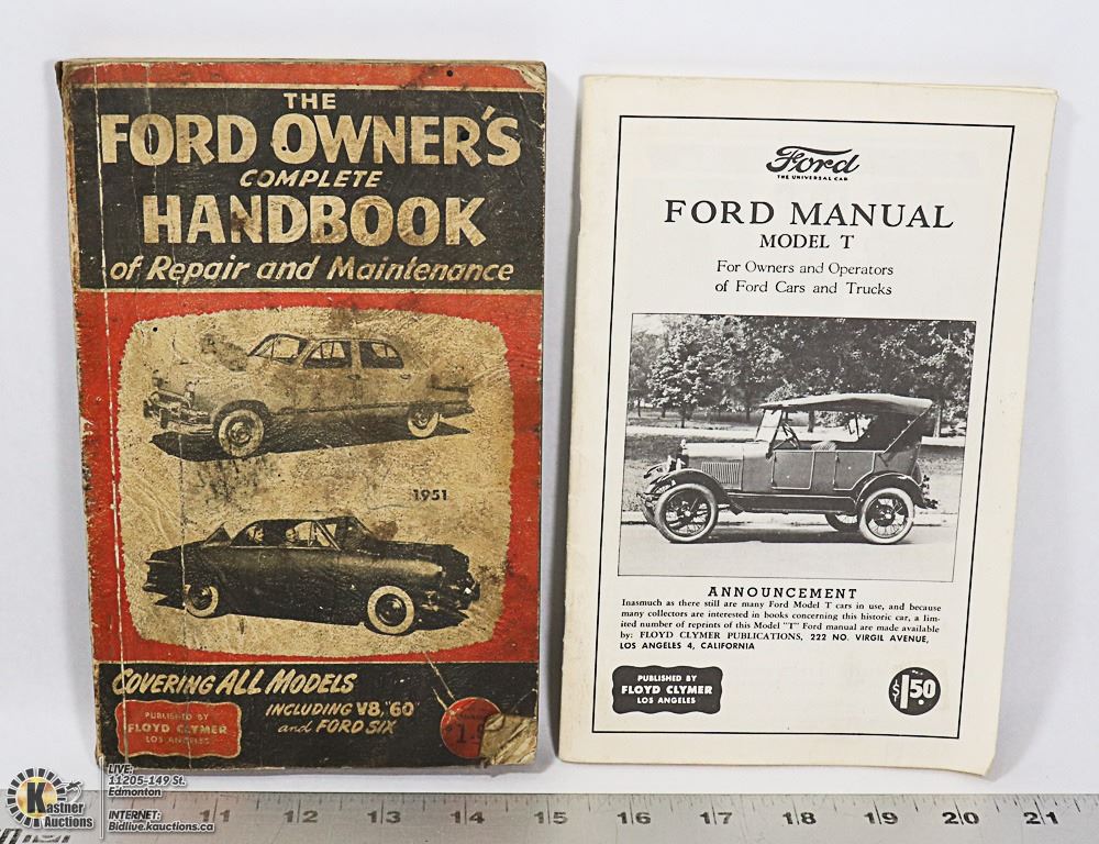 INCL. FLOYD CLYMER REPRODUCTION - 1950'S FORD MODEL T MANUAL AND 1951 FORD OWNERS COMPLETE HANDBOOK - VINTAGE